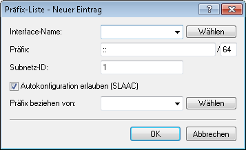 Sollte im Gerät das ausgeschlossene Präfix für das LAN konfiguriert sein, erfolgt eine Syslog-Meldung und das Präfix wird im LAN nicht angekündigt. In diesem Fall konfigurieren Sie unter IPv6 > Router-Advertisement > Präfix-Liste manuell eine andere Subnetz-ID für dieses LAN, um den Konflikt aufzulösen.