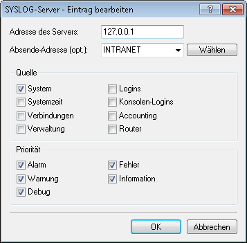 Ab LCOS-Version 9.20 ist die Adressangabe eines SYSLOG-Servers zusätzlich in Form einer IPv6-Adresse oder eines DNS-Namens möglich.