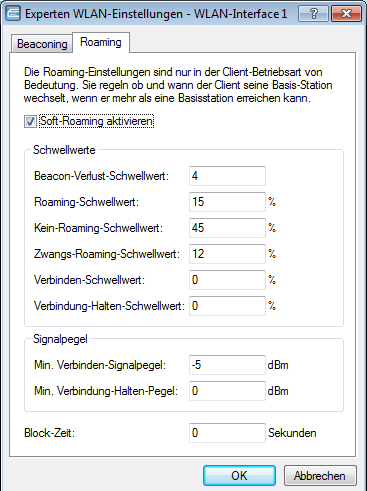 - Soft-Roaming Diese Option ermöglicht dem Client, anhand verfügbarer Scan-Informationen ein Roaming zu einem stärkeren AP durchzuführen (Soft-Roaming). Roaming aufgrund eines Verbindungsverlustes (Hard-Roaming) bleibt davon natürlich unbeeinflusst. Die eingestellten Roaming-Schwellwerte haben nur eine Funktion, wenn Soft-Roaming aktiviert ist.