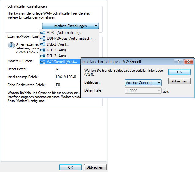 - Modem: In der Einstellung als 'Modem' versucht das Gerät, an der seriellen Schnittstelle ein Modem zu erkennen. Bei Erfolg kann das Modem als zusätzliche WAN-Schnittstelle verwendet werden. Wird jedoch ein angeschlossener Rechner mit Terminalprogramm an der seriellen Schnittstelle festgestellt, schaltet das Gerät die Schnittstelle automatisch in den Modus zur Outband-Konfiguration um.