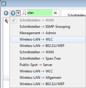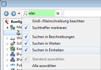 - Geben Sie im Suchfeld den gewünschten Begriff ein, z. B. wlan. Die Suche unterscheidet nicht nach Groß- und Kleinschreibung. Sie können Teile von Worten oder Zahlen ebenso eingeben wie komplette Suchbegriffe. Leerzeichen in den Suchbegriffen suchen auch nur nach Zeichenketten, welche die entsprechenden Leerzeichen enthalten. Die Suchfunktion unterstützt jedoch keine Wildcards.