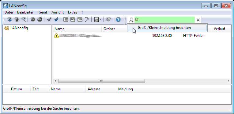 In der Hauptansicht von LANconfig finden Sie den QuickFinder in der Symbolleiste. Geben Sie im Suchfenster einen Suchbegriff ein, um die Liste der angezeigten Geräte zu reduzieren. LANconfig durchsucht dabei alle Werte, die in den Spalten der Geräte-Liste verfügbar sind – auch die derzeit ausgeblendeten Spalten. Klicken Sie auf der Symbol neben der Lupe, um bei der Suche die Groß-/Kleinschreibung zu beachten.