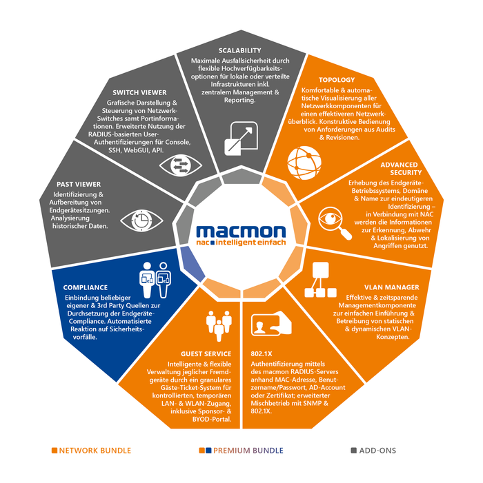 macmon Network Access Control (NAC) erkennt, überwacht und schützt die Netzwerkzugänge in Unternehmen und Organisationen vor unberechtigten Zugriffen. Damit trägt macmon einen erheblichen Teil dazu bei, Übersicht und Kontrolle in komplexe, heterogene Netzwerke zu bringen und das Risiko vor potenziellen Angriffen zu minimieren. macmon bringt jedem Unternehmen eine flexible und effiziente NAC-Lösung, die mit geringem Aufwand schnell implementiert wird. Der erhebliche Mehrwert für macmon-Nutzer ist, neben Übersicht und Kontrolle auch das automatische Schalten und Zuweisen anhand von Regeln, die den Netzwerk-Administratoren Aufwände sparen. Davon zeugen über 1.300 zufriedenen Kunden. macmon NAC bietet zu jeder Zeit die vollständige Übersicht der gesamten Netzwerkumgebung, nimmt viele notwendige Konfigurationen automatisch vor und garantiert so den Schutz vor unbefugten Zugriffen und Netzwerkangriffen. Um Netzwerke vor unbefugten Zugriffen zu schützen, bietet macmon zwei Produktpakete sowie Add-Ons an: