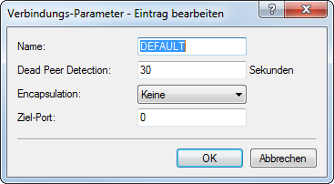 In dieser Tabelle definieren Sie die Parameter von IKEv2-VPN-Verbindungen, die nicht Bestandteil der SA-Verhandlung sind. Es existiert ein Standardeintrag "DEFAULT" mit gängigen Einstellungen.