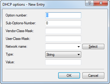 - Filter criterion used by some manufacturers for requests to the DHCP server. See also Vendor-class mask. Strings that the DHCP server requires to be present in incoming requests can be entered here. The DHCP option is only delivered when the configured filter matches the DHCP request. The wildcards "*" (any number of characters) and "?" (exactly one character) can be used. If the fields are empty, they are ignored and the option is always delivered.