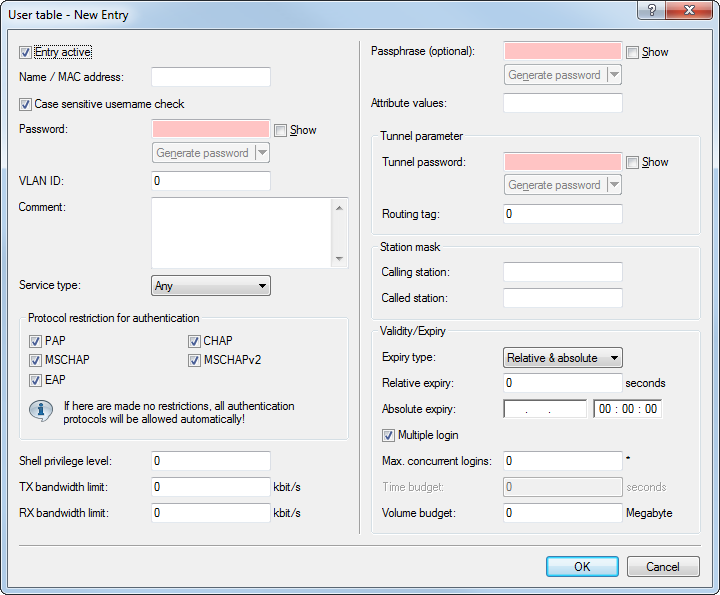 The RADIUS user database under now features the parameter Attribute values, which can be used to add vendor-specific attributes.