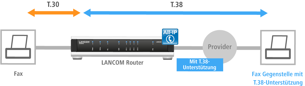 Wenn der Provider oder die entsprechende Fax-Gegenstelle T.38 unterstützt, wandelt der LANCOM Router T.30 automatisch in T.38 um.