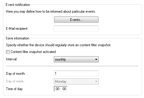 Under you determine whether you wish to be notified of events and where LANCOM Content Filter information is to be stored.