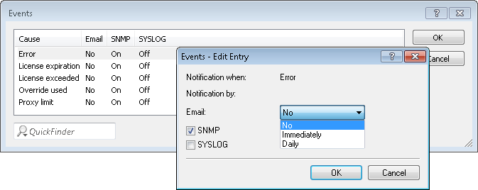 As of LCOS version 9.10, it is possible to send e-mail notifications about the causes of content-filter events, either immediately or daily depending on the cause.