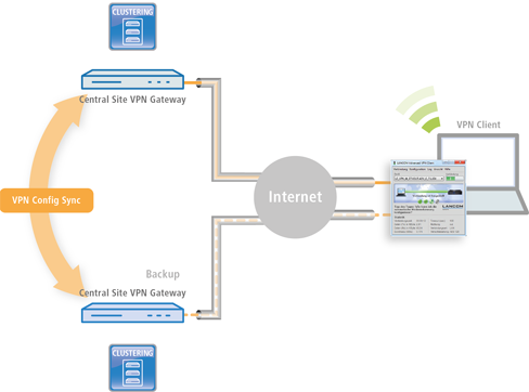 For this purpose the backup central-site VPN gateway needs to have the same configuration as the primary central-site VPN gateway. In particular VPN user data and the firewall configuration must be present on both devices in order for a user to be authenticated and the services to be provided correctly. This requires a manual setup of each individual device—in other words, a huge amount of work for the administrator.