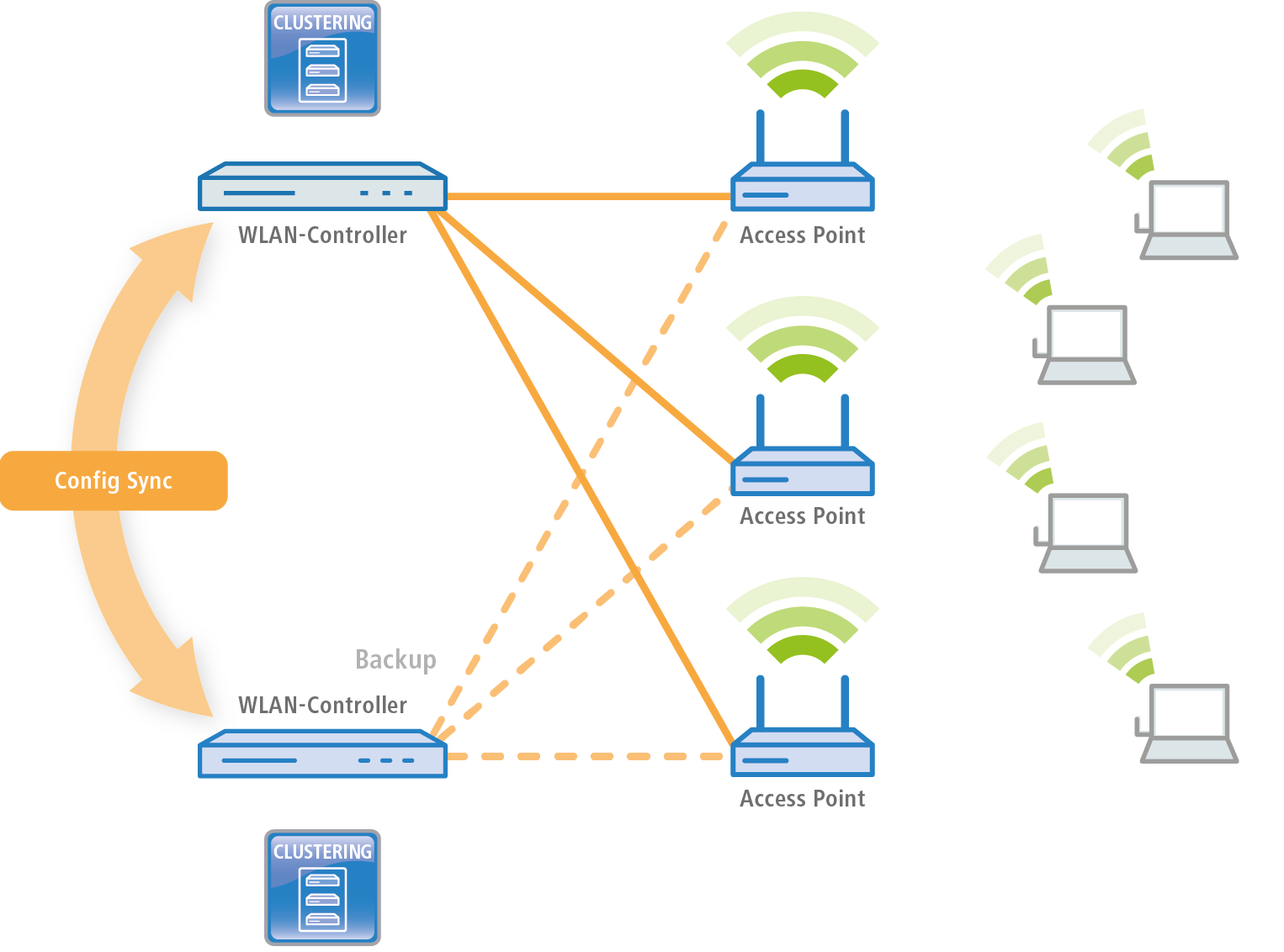 The LANCOM WLC High Availability Clustering XL option offers greatly simplified administration and huge time savings because you only need to configure one WLC in the cluster. The WLC then transfers the changes to the other cluster devices automatically. In the case of maintenance downtime (e.g. for a firmware update) or even the failure of a WLC, the APs automatically connect to another WLC which, thanks to Config Sync, already has the identical configuration without any intervention by the administrator. The result is a convenient way to high availability.