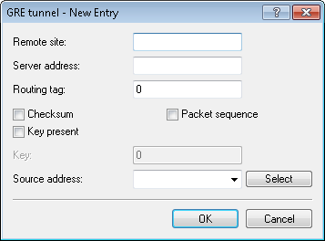 Here you specify whether the GRE header should contain a key for data-flow control. If you enable this feature, the device inserts the value set in the key field into the GRE header for this GRE tunnel. The device only maps incoming data packets to this GRE tunnel if their GRE header contains an identical key value. With this feature disabled, the GRE header of outgoing data packets does not contain a key value. The device only maps incoming data packets to this GRE tunnel if their GRE header similarly does not contain a key value.