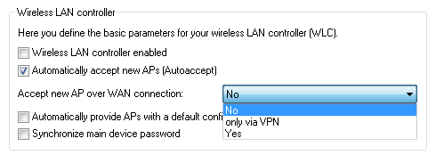 The configuration is done under in the section Wireless LAN controller. If the automatic acceptance of new APs is enabled, you can use the feature Accept new AP over WAN connection to control whether the CAPWAP service is available to WAN remote stations.