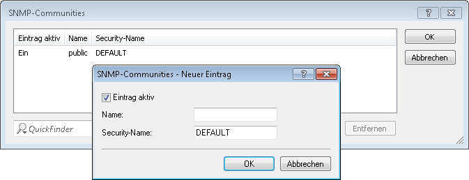 Um eine autorisierte Abfrage von Zugangsdaten beim SNMP-Lesezugriff über SNMPv1 oder SNMPv2c zu erzwingen, deaktivieren Sie die Community public in der Liste der SNMP-Communities. Dadurch lassen sich Informationen über den Zustand des Gerätes, aktuelle Verbindungen, Reports, etc. erst dann via SNMP auslesen, nachdem sich der betreffende Benutzer am Gerät authentifiziert hat. Die Autorisierung erfolgt wahlweise über die Zugangsdaten des Administrator-Accounts oder über den in der individuellen SNMP-Community definierten Zugang.