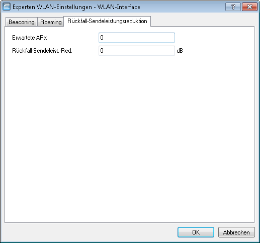 Anmerkung: Die standardmäßige Sendeleistungs-Reduktion konfigurieren Sie unter mit der Schaltfläche Physikalische WLAN-Einst. (und ggf. Auswahl der WLAN-Schnittstelle) im Dialog unter Radio.