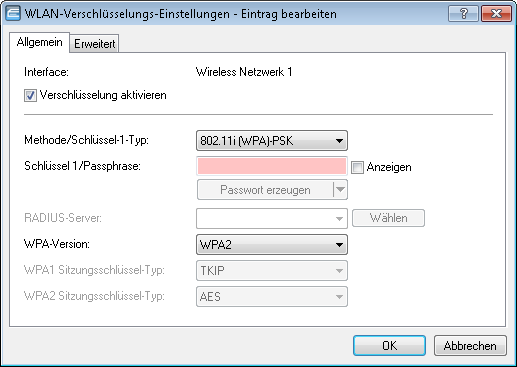 - Wenn Sie unter Methode/Schlüssel-1-Typ eine Authentifizierung nach dem Standard IEEE 802.1X auswählen, geben Sie hier das Profil eines RADIUS-Servers an.