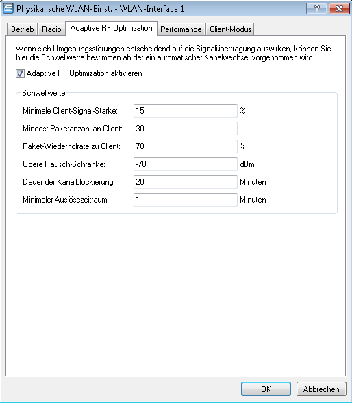 - Wird ein Kanal als unbrauchbar erkannt, wird er für diese Zeit markiert / blockiert. Dieser Wert steuert auch die Blockierungszeit des Kanalwechseltriggers, falls alle Kanäle gleichzeitig blockiert sind. Die Angabe erfolgt in Minuten (Defaultwert: 20).