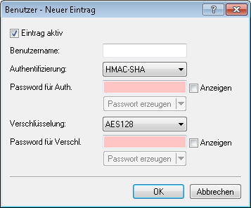 Neben den am Gerät registrierten Administratoren ist der Zugriff auch für einzelne Nutzer möglich. Hier konfigurieren Sie die Einstellungen für Authentifizierung und Verschlüsselung für diese Anwender bei Nutzung von SNMPv3.