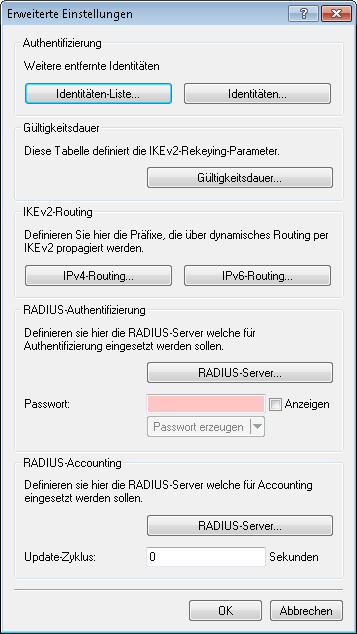 In diesem Dialog konfigurieren Sie die Einstellungen zur Authentifizierung weiterer entfernter Identitäten, die IKEv2-Rekeying-Parameter, die Präfixe für da IKEv2-Routing sowie die RADIUS-Server für IKEv2.