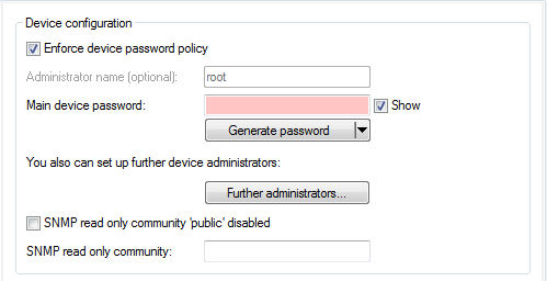 The switch Enforce device password policydetermines the following policies for the main device password and the administrator passwords: