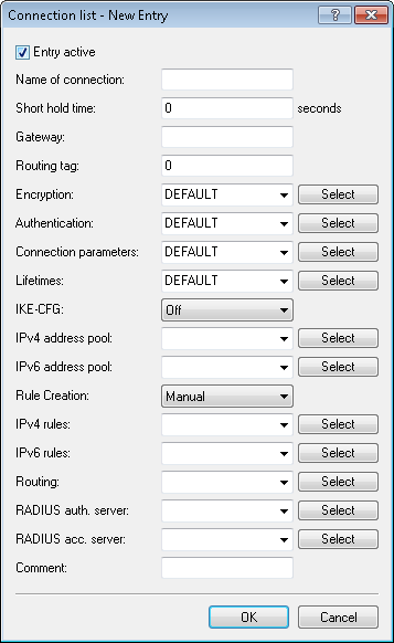 - Specifies the routes that the remote site should transmit dynamically via IKE-CFG mode. This function is only available in the IKEv2 CFG mode for the client and server. The routes for IPv4 and IPv6 connections are located in the tables.