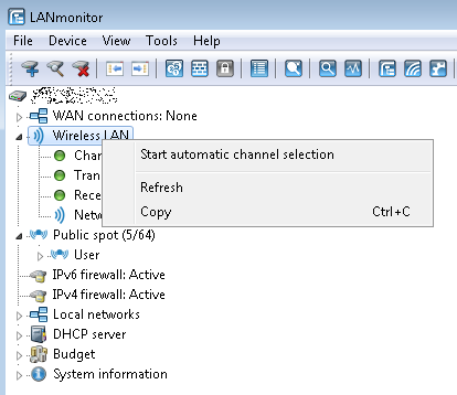 LANmonitor gives you the option to instruct each AP in the network to manually perform a channel change. Go to the Wireless LAN view. Right-click with the mouse on the interface that you want to perform a channel change and, in the submenu, select Perform automatic channel selection.