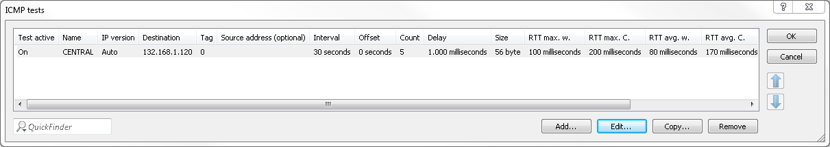 Click the button ICMP tests, add new queries and set guideline values for the connection tests.