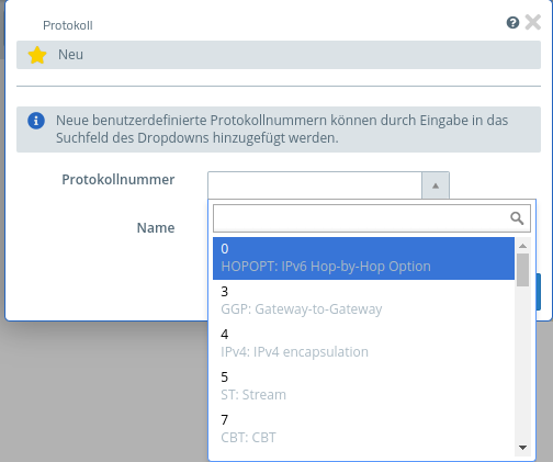 Eine Protokollnummer von 0 bis 255 kann gewählt werden. Die vorgeschlagenen Werte entsprechen denen der IANA.