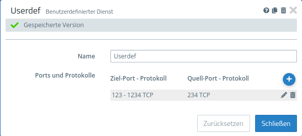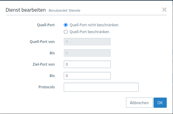 Im Bearbeitungsfenster Benutzerdefinierte Dienste wurden die Eingabemöglichkeiten erweitert, um ggf. den Quell-Port anzugeben.