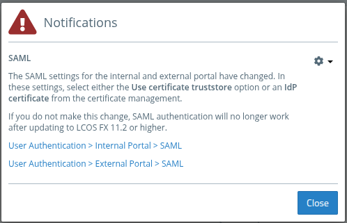 As of LCOS FX 11.2, the following changes to the SAML settings have been introduced for both the internal and external portal. New options are now available for using the certificate truststore, selecting an optional IdP certificate (formerly "IdP Certificate (PEM)"), and specifying a base group ID.
