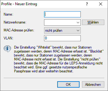 - Die MAC-Adresse wird für die LEPS-Anmeldung nicht beachtet. Eine ggf. gesetzte benutzerspezifische Passphrase wird hingegen geprüft.