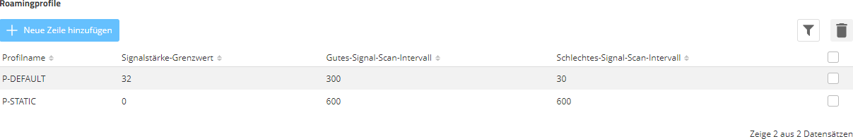- Fällt die Signalstärke auf den angegebenen Grenzwert, wird direkt ein Scan ausgelöst, um nach einem besseren Access Point zu suchen. Ist kein besserer Access Point vorhanden, wird in der angegebenen Zeit in Sekunden weiter gesucht, bis eine Verbindung zu einem Access Point mit einer besseren Signalstärke verbunden werden konnte oder sich das Signal mit dem verbundenen Access Point wieder verbessert hat.
