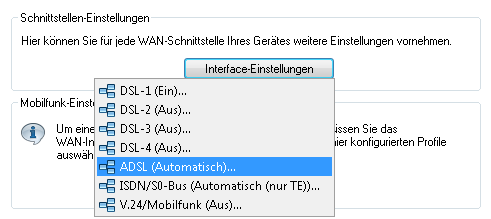 Sie können das ADSL-Protokoll in der Gerätekonfiguration im Abschnitt 'Schnittstellen' einstellen. Wählen Sie hier unter Interface-Einstellungen den Punkt 'ADSL'.