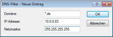 Anmerkung: Bei der Eingabe der Domäne sind auch die Wildcards '?' (steht für genau ein Zeichen) und '*' (für beliebig viele Zeichen) erlaubt.Um nur einem bestimmten Rechner (z. B. mit IP 10.0.0.123) den Zugriff auf DE-Domains zu sperren, tragen Sie folgende Werte ein:Im Konsolenmodus lautet der Befehl: set 002 *.de 10.0.0.123 255.255.255.255