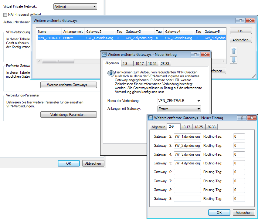 - Gateway 2 bis Gateway 9: Adresse der alternativen Gateways, als IP-Adresse oder auflösbarer DNS-Name.