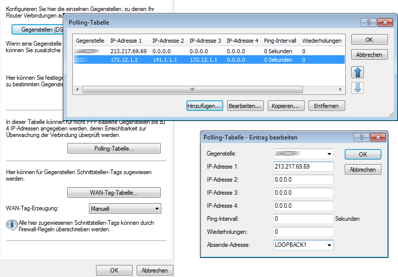 Zu jeder Gegenstelle können dabei bis zu vier verschiedene IP-Adressen eingetragen werden, die parallel im entfernten Netz geprüft werden. Nur wenn alle eingetragenen IP-Adressen nicht erreichbar sind, gilt die Leitung als gestört.