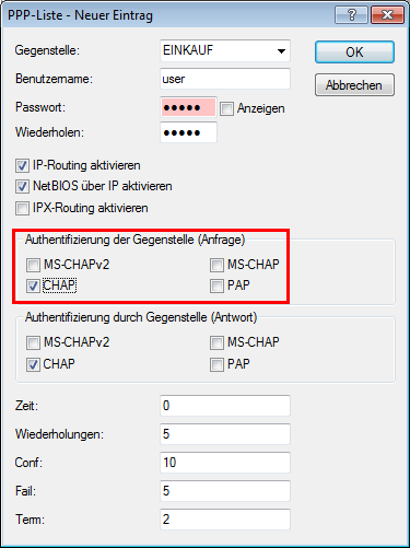 Dazu wird der Benutzer 'Einkauf' als Gegenstelle ohne Benutzername, aber mit einem gemeinsamen Kennwort für alle Mitarbeiter in der Abteilung in der PPP-Liste angelegt (LANconfig / Kommunikation / Protokolle) und die Authentifizierung (verschlüsselt) über CHAP vorgegeben. Für diesen PPP-Benutzer werden sowohl IP-Routing als auch NetBIOS (Windows Networking) aktiviert: