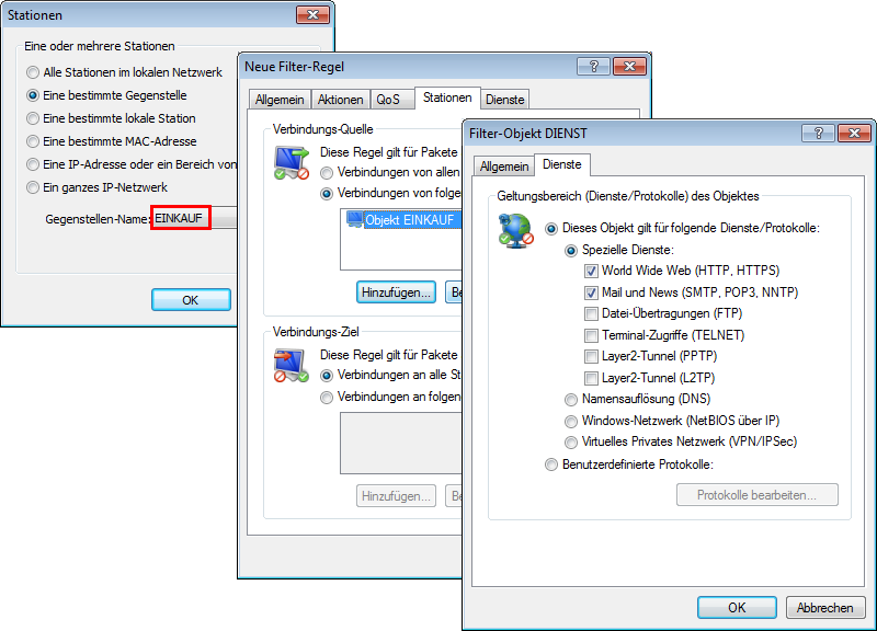 Mit Hilfe der Firewall (LANconfig / Firewall/QoS / Regeln) können die erlaubten Dienste für die Mitarbeiter des Einkaufs gesteuert werden (z. B. nur Freischalten von HTTP und EMAIL).