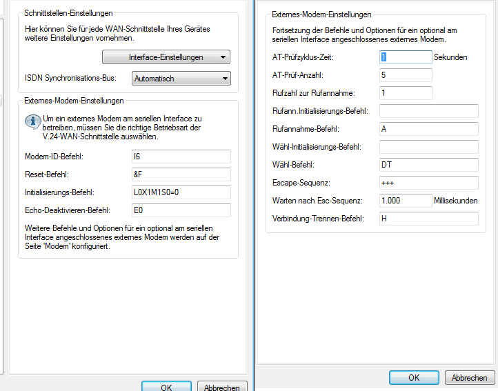 Für den Betrieb eines Modems an der seriellen Schnittstelle müssen folgende Parameter eingestellt werden: