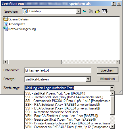 - Wählen Sie Speicherort und den Typ des Zertifikats aus, der gesichert oder hochgeladen werden soll und bestätigen Sie die Auswahl mit Speichern/Öffnen.