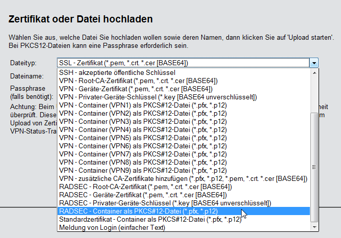 Für die TLS-Verschlüsselung der RADSEC-Verbindung werden separate X.509-Zertifikate benötigt. Die einzelnen Zertifikate (Root-Zertifikat, Geräte-Zertifikat und privater Schlüssel) können entweder einzeln oder als PKCS#12-Container in das Gerät geladen werden.