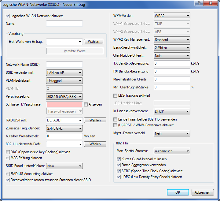 Anmerkung: Das einfache Unterdrücken der SSID bietet keinen ausreichenden Zugriffsschutz, da der AP diese bei der Anmeldung berechtigter WLAN-Clients im Klartext überträgt und sie somit für alle im WLAN-Netz befindlichen WLAN-Clients kurzfristig sichtbar ist. - RADIUS-Accounting aktiviert