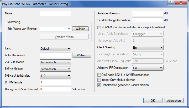 - Vererbung Auswahl eines schon definierten Satzes von physikalischen WLAN-Parametern, von dem die Einstellungen übernommen werden sollen.