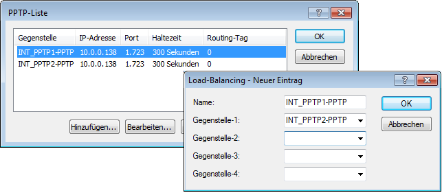 - Eine Bündelung erfolgt dann, wenn für die physikalische Verbindung der PPTP-Gegenstelle in der Load-Balancing-Liste zusätzliche Gegenstellen definiert sind. Die PPTP-Verbindung fordert dann im Bündelfall die nächste physikalische Verbindung an und baut sie dorthin auf. Tragen Sie die Bündelverbindungen in LANconfig über IP-Router / Routing / Load-Balancing ein. Telnet: /Setup/IP-Router/Load-Balancer