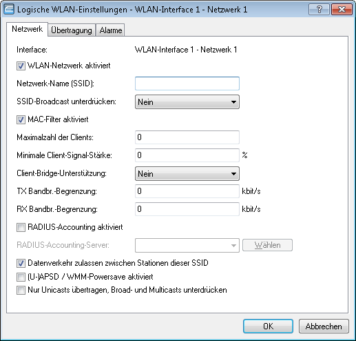 Die maximalen Bandbreiten für ein Gerät im Client-Modus werden im LANconfig unter mit einem Klick auf Logische WLAN-Einstellungen und Auswahl der entsprechenden logischen WLAN-Schnittstelle auf der Registerkarte Netzwerk eingetragen.