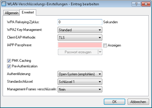 Für den Zugriff auf ein WLAN müssen in der Clientstation die entsprechenden Verschlüsselungsmethoden und Schlüssel eingestellt werden.