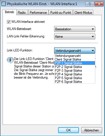 Die Anzeige der Signalqualität über die LEDs muss für die physikalische WLAN-Schnittstelle aktiviert werden (LANconfig: Wireless LAN / Allgemein / Physikalische WLAN-Einstellungen / Betrieb). Je schneller die LED blinkt, umso besser ist die Verbindung (eine Blinkfrequenz von 1 Hz steht für eine Signalqualität von 10 dB, eine Verdoppelung der Frequenz zeigt die jeweils doppelte Signalstärke).