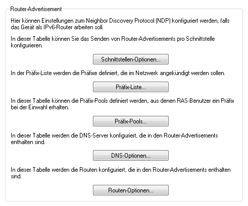 In der Konfiguration Router-Advertisement bieten sich Ihnen mehrer Schaltflächen mit Optionen zu Einstellungen des Neighbor Discovery Protocol (NDP), falls das Gerät als IPv6-Router arbeiten soll: