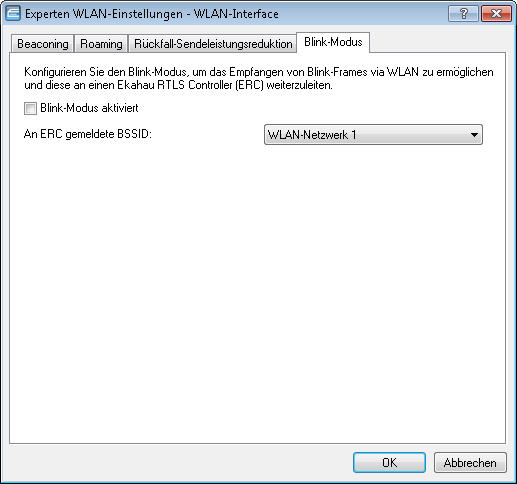 - Wählen Sie hier die logische WLAN-Schnittstelle aus, die das Gerät an den ERC melden soll. Der ERC hat diese BSSID mit einem Ort "gemappt" (z. B. Serverraum) und weiß entsprechend, dass z. B. Wi-Fi Tag "A" sich in diesem Moment im Serverraum befindet, wenn der "Blink" über die BSSID des entsprechenden APs hereinkommt.