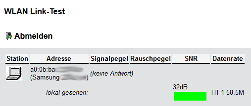 Diese Seite zeigt die Ergebnisse des WLAN Link-Tests an. Der WLAN Link-Test prüft die Verbindung zu verbundenen WLAN Clients.